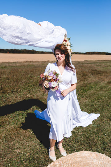 Nos robes de mariées se démarquent par leur élégance et leur conscience écologique. Elles sont fabriquées à partir de tissus conçues avec des bouteilles recyclées, issus d'une entreprise d'ici au Canada.